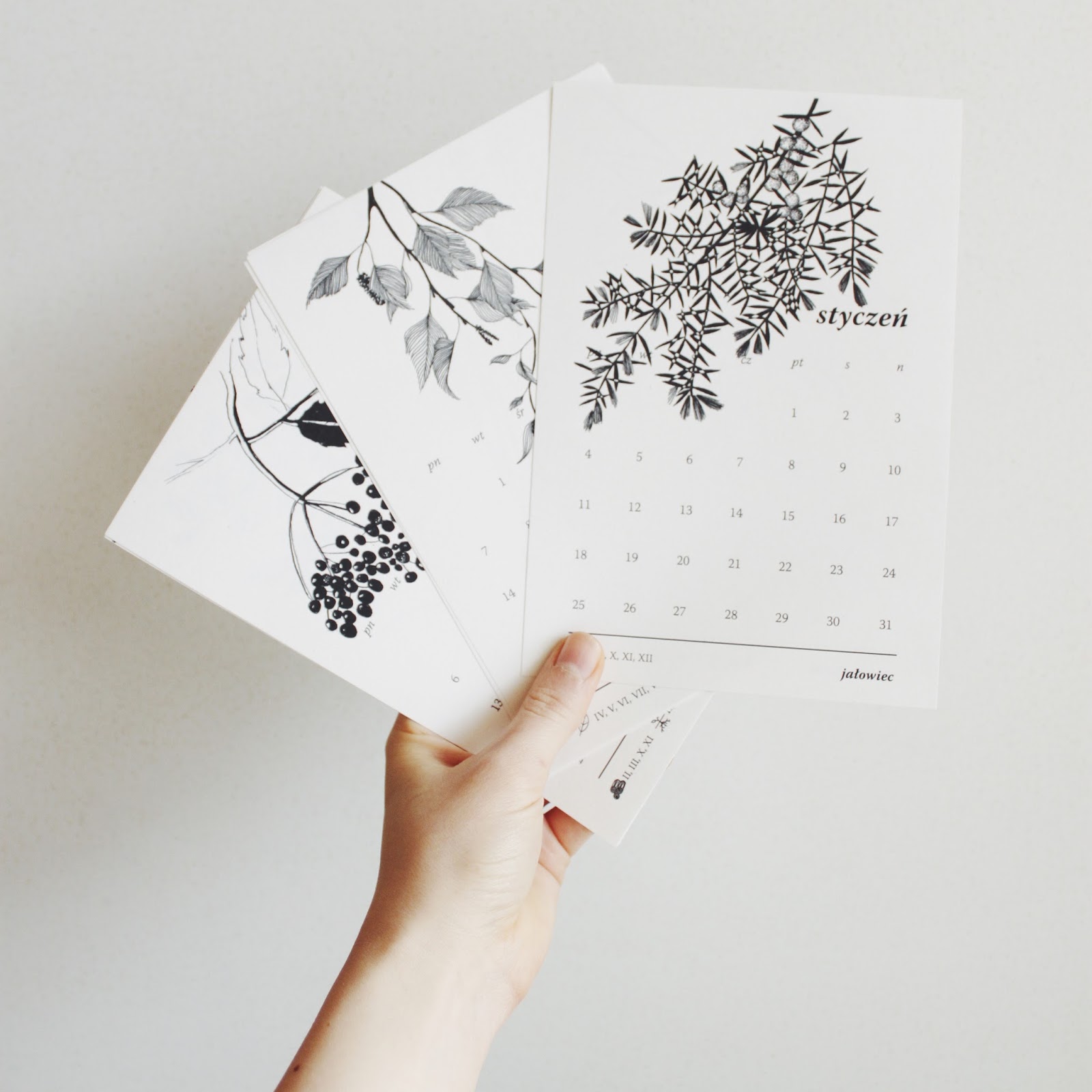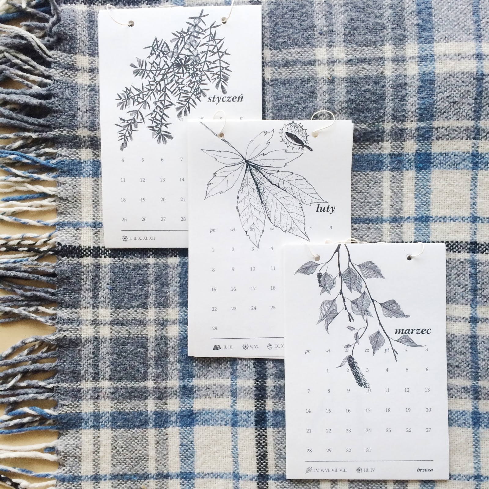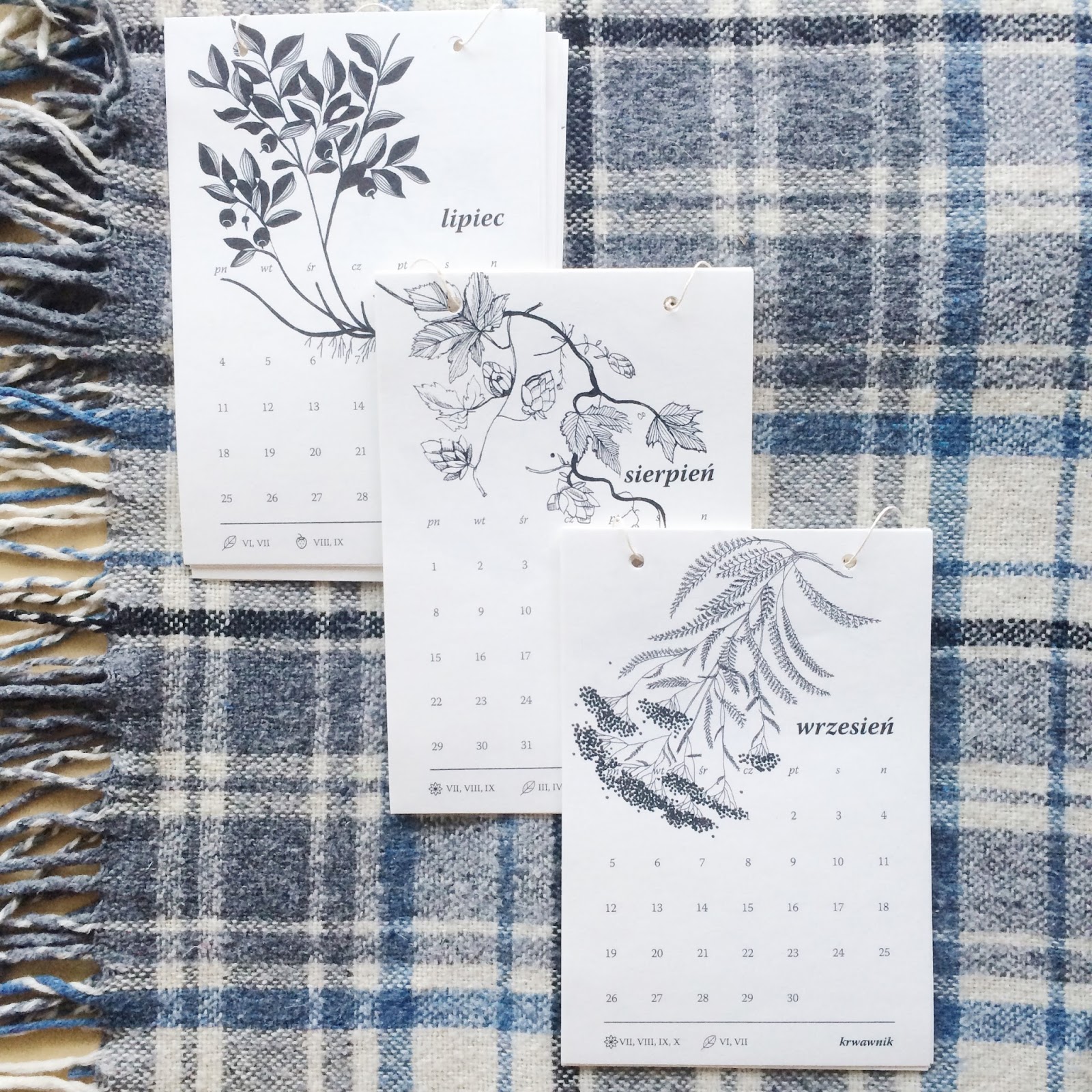 Do każdego miesiąca dopasowaliśmy po jednej, dziko rosnącej roślinie. Za pomocą piktogramów, oznaczyliśmy w którym miesiącu, jaką część danej rośliny zbieramy. Są to po kolei: jałowiec, kasztanowiec, brzoza, tatarak, pokrzywa, czarny bez, jagoda, chmiel, krwawnik, głóg, tarnina oraz jemioła.