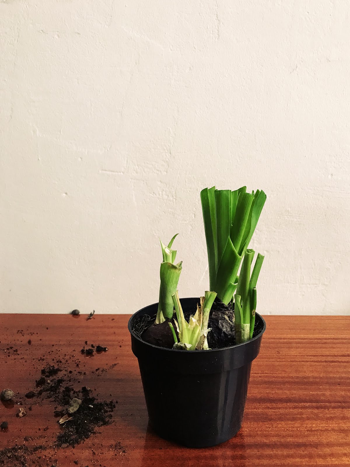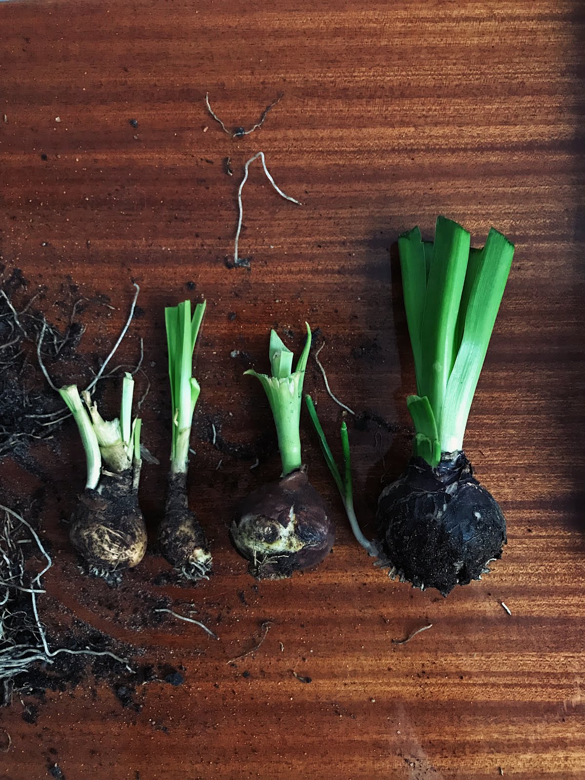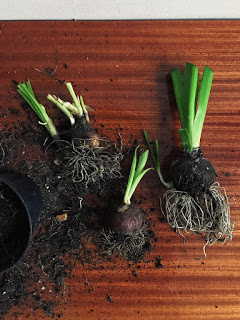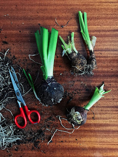 2. Wyjmujemy zawartość doniczki, oczyszczamy (wystarczy palcami lub ręcznikiem papierowym) cebulki z ziemi i nożyczkami odcinamy korzenie.